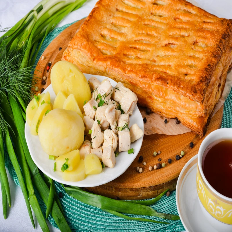 Пирог слоёный с курицей и картофелем